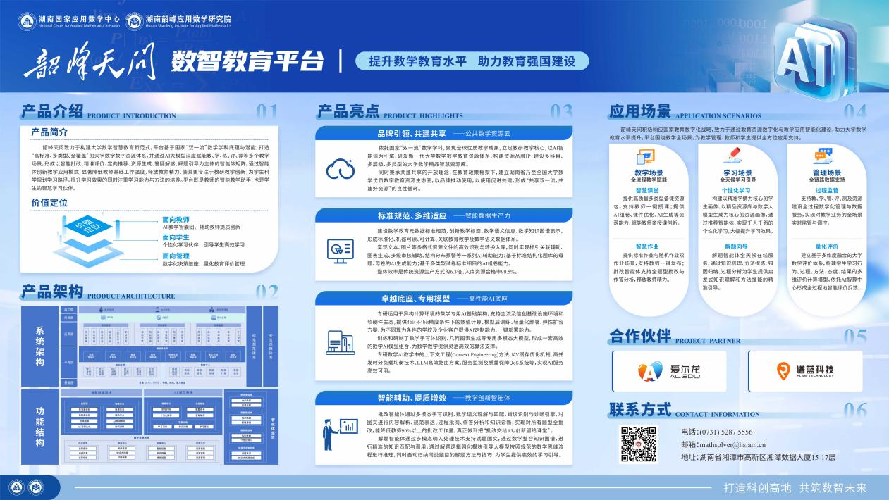 韶峰天问数智教育平台致力于构建大学数学智慧教育新范式。平台基于国家“双一流”数学学科底蕴与潜能,打造“高标准、多类型、全覆盖”的大学数学数字资源体系,并通过AI大模型深度赋能教、学、练、评、荐等多个教学场景,形成以智能批改、精准评价、定向推荐、资源生成、答疑解惑、解题引导为主体的智能体矩阵。通过智能体创新教学应用模式,显著降低教师基础工作强度,释放教师精力,使其更专注于教研教学创新;为学生科学规划学习路径,提升学习效果的同时注重学习能力与方法的培养。平台既是教师的智能教学助手,也是学生的智慧学习伙伴。