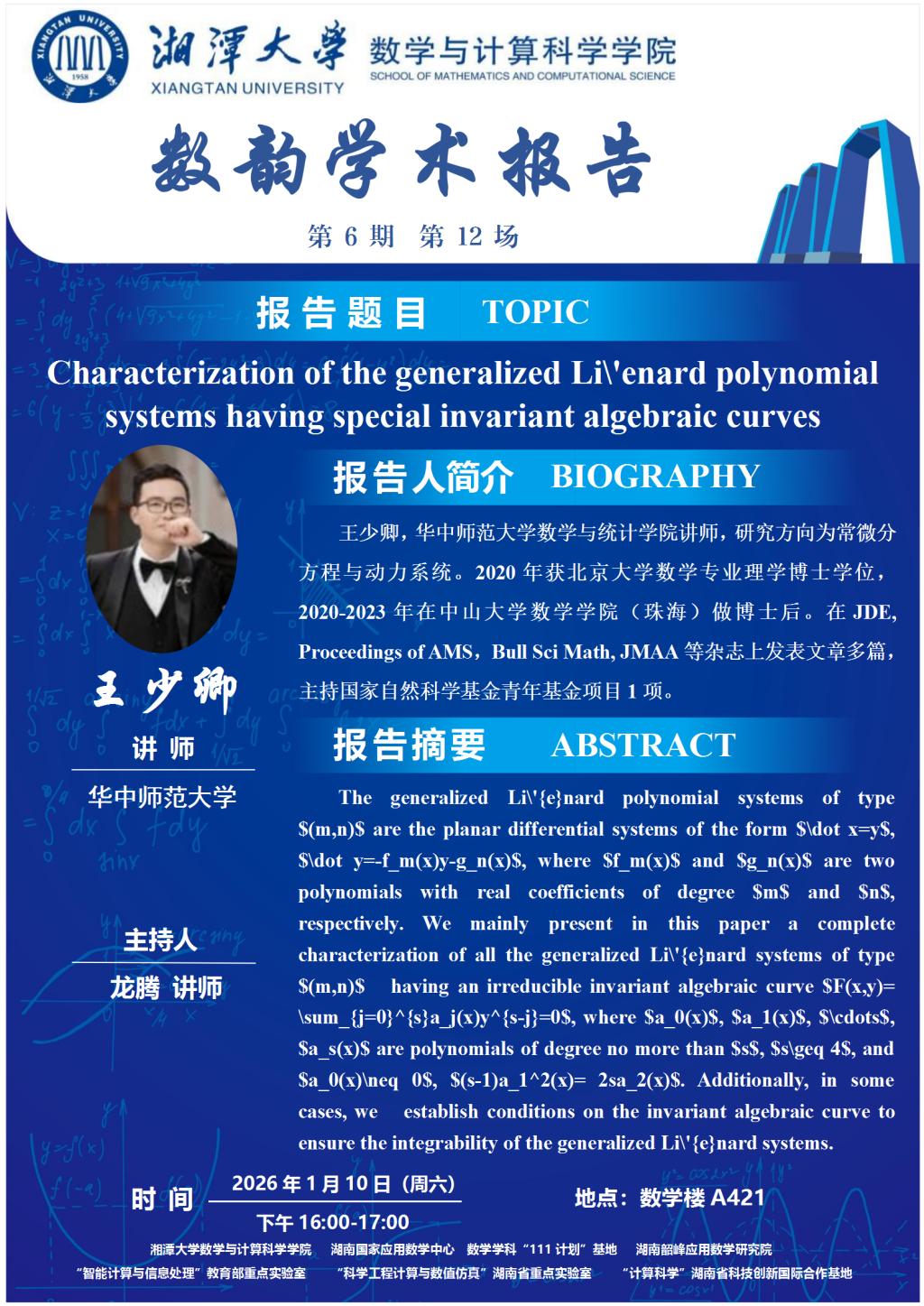 数韵学术报告-王少卿-Characterization of the generalized Li\'enard polynomial systems having special invariant algebraic curves