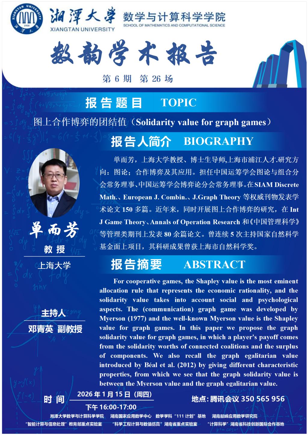 数韵学术报告-单而芳-图上合作博弈的团结值(Solidarity value for graph games)